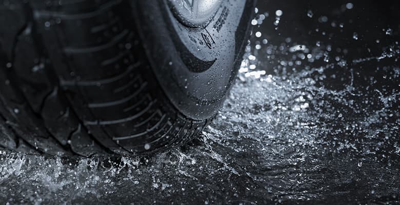 The tread depth is a substantial safety factor. It has an important influence on the vehicle’s contact with the ground.While braking, the Anti-lock Braking System is controlling the wheel at the slip threshold and water is collected. The tyre tread becomes saturated and the braking distance increases drastically.Hydroplaning depends on water depth, tread depth and driving speed. In order to measure hydroplaning, a car is driven into a basin with 8 mm of water and speeds up. As soon as the motor works harder without speeding up, hydroplaning starts.
